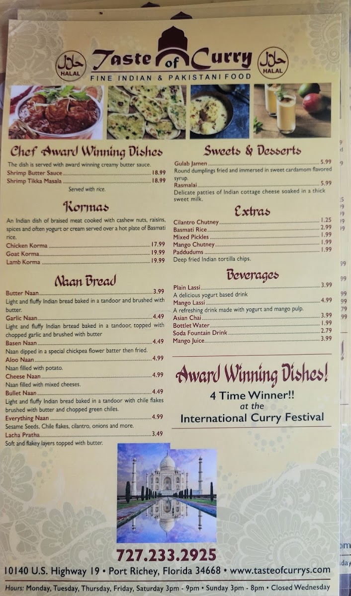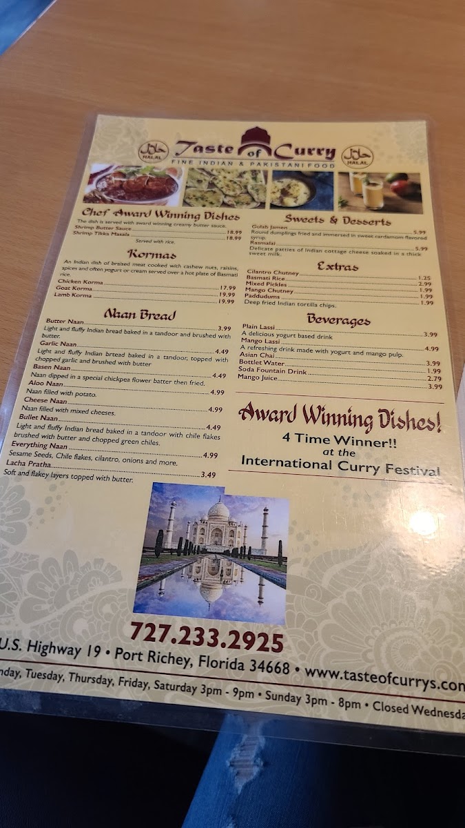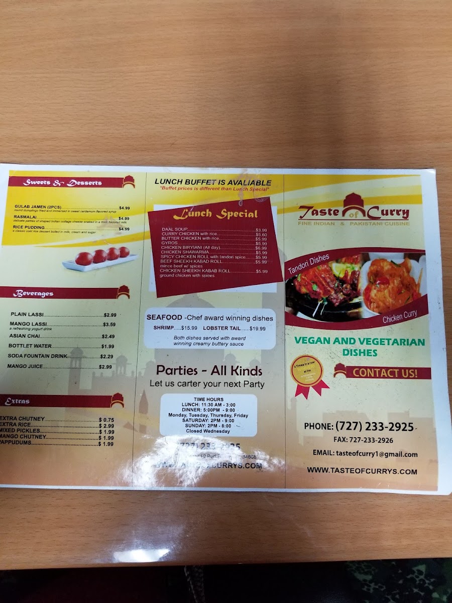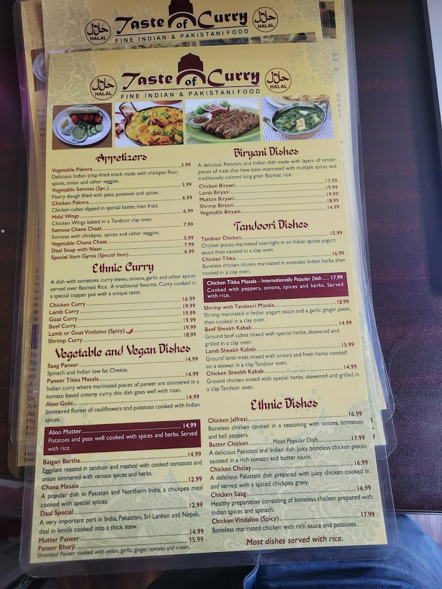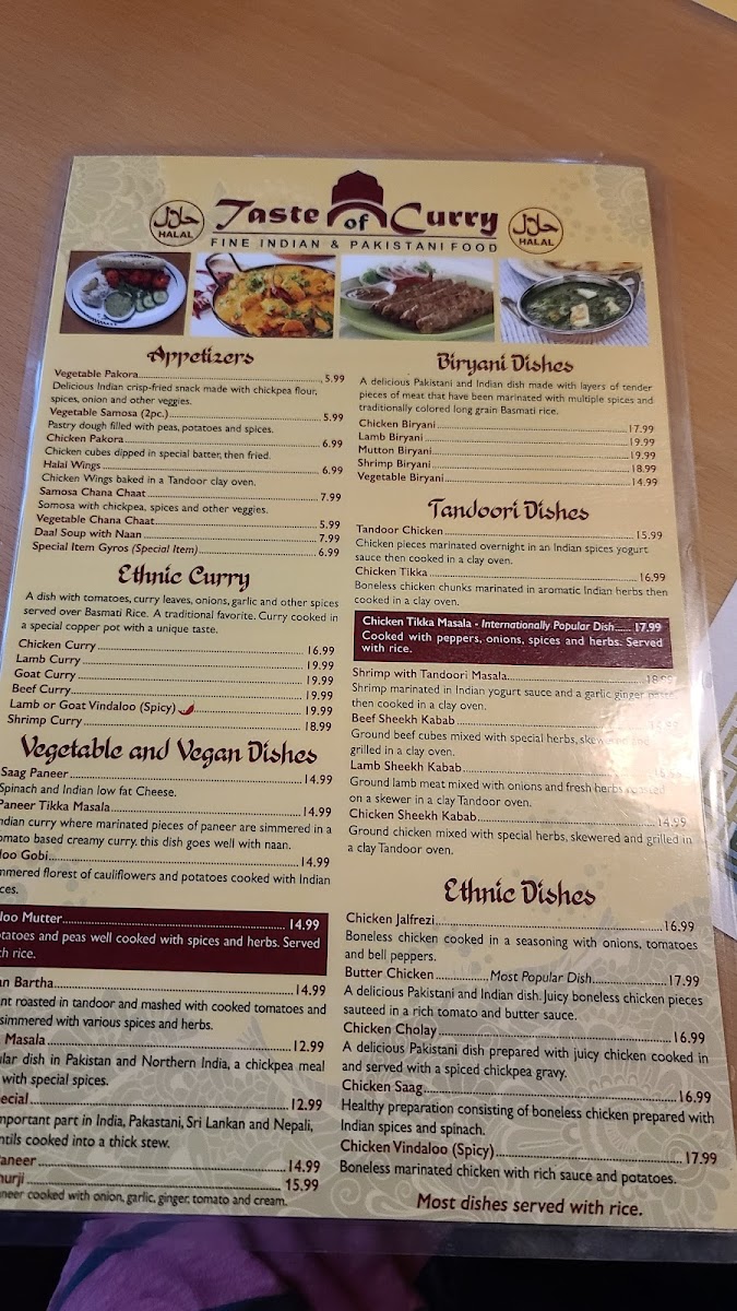 From a reviewer’s perspective, the menu at Taste Of Curry is a well-rounded celebration of classic Indian flavors, offering something for both newcomers and seasoned curry lovers. The biryani selection alone is impressive, featuring Vegetable Biryani, Shrimp Biryani, Goat Biryani, Mutton Biryani, and Lamb Biryani, each promising aromatic rice layered with bold spices and hearty proteins. For a sweet finish, traditional desserts like Rice Pudding, Rasmalai, and Gulab Jamun (2 Pcs.) provide a comforting balance to the savory dishes. The tandoori section highlights smoky, char-grilled favorites such as Tandoor Chicken, Chicken Tikka Masala, Shrimp With Tandoori Masala, Chicken Sheekh Kabab, and Beef Sheekh Kebab, perfect for those who enjoy robust flavors straight from the clay oven. Starters like Chicken Pakora, Vegetable Samosa (2 Pcs.), Halal Wings (5 Pce), Samosa Chana Chaat, and Vegetable Pakora set the tone with crispy textures and warming spices, while extras including Mixed Pickles, Mango Chutney, Rita A Yogurt Base Sauce, Cilantro Chutney, and Extra Chutney allow diners to customize every bite. Freshly baked breads such as EVERY THING NAAN, Besen Naan, BULLET NAAN, Garlic Naan, and Plain Naan are ideal for soaking up rich gravies. The vegetarian and meat-based mains span comforting classics like Lamb Saag, Baigan Bharta, PANEER TIKA MASALA, Aloo Gobi, Chana Masala, alongside ethnic favorites such as Chicken Jalfrezi, Chicken Cholay, Chicken Saag, Chicken Vindaloo, and Butter Chicken. Creamy Goat Korma, Lamb Korma, and Chicken Korma cater to fans of milder, nut-based sauces, while curry lovers can explore Chicken Curry, Lamb Vindaloo, Goat Curry (With Bone In), Shrimp Curry, and Lamb Curry (No Bone Or Bone In). The Chef Award Winning Dish - Shrimp Butter Sauce stands out as a must-try, complemented by specials like Beef Curry. To round out the experience, beverages such as Soda Fountain Drink, Mango Lassi, Plain Lassi, Bottled Water, and Asian Chai provide refreshing and traditional options, making the menu feel complete and thoughtfully curated.